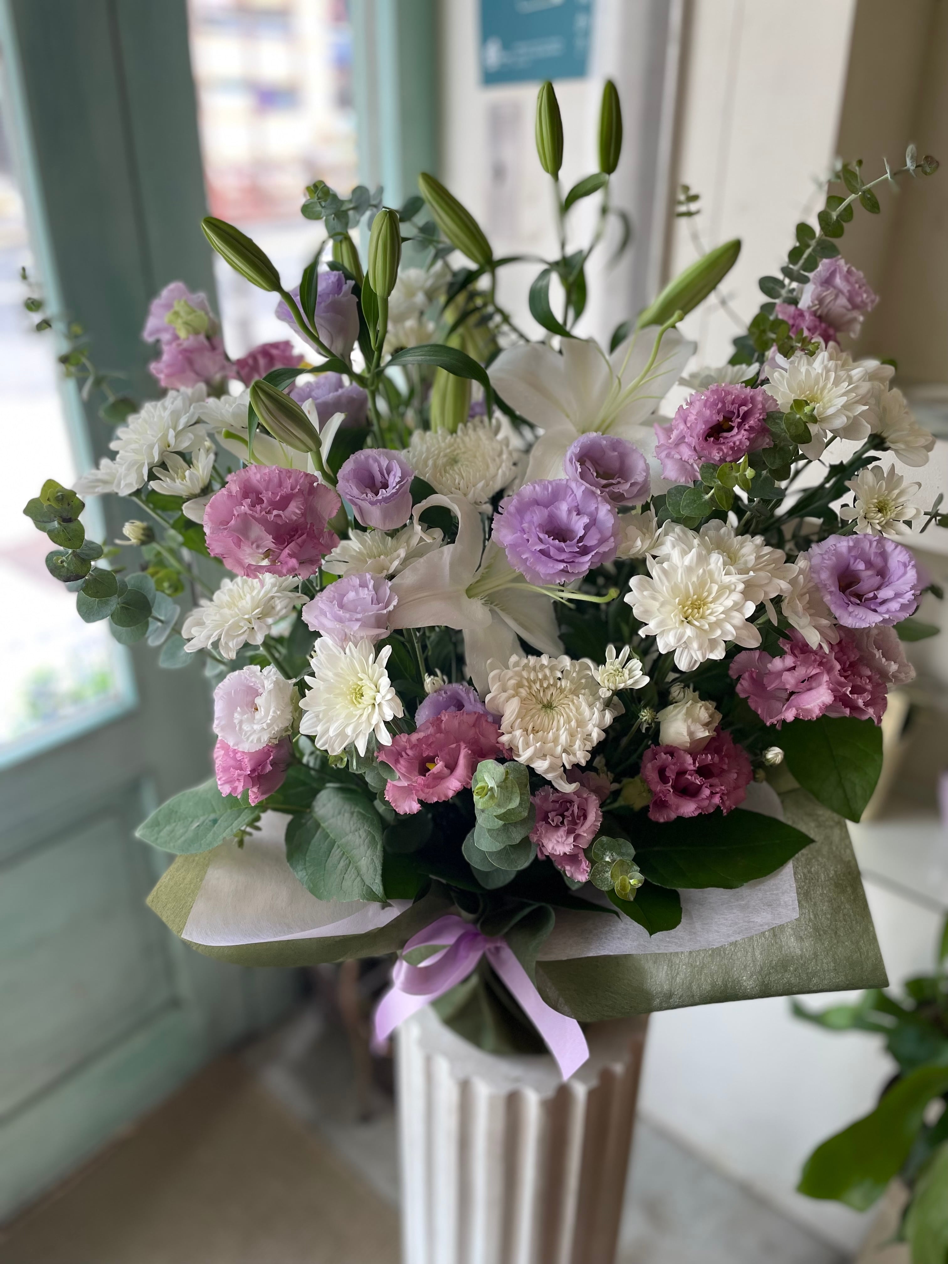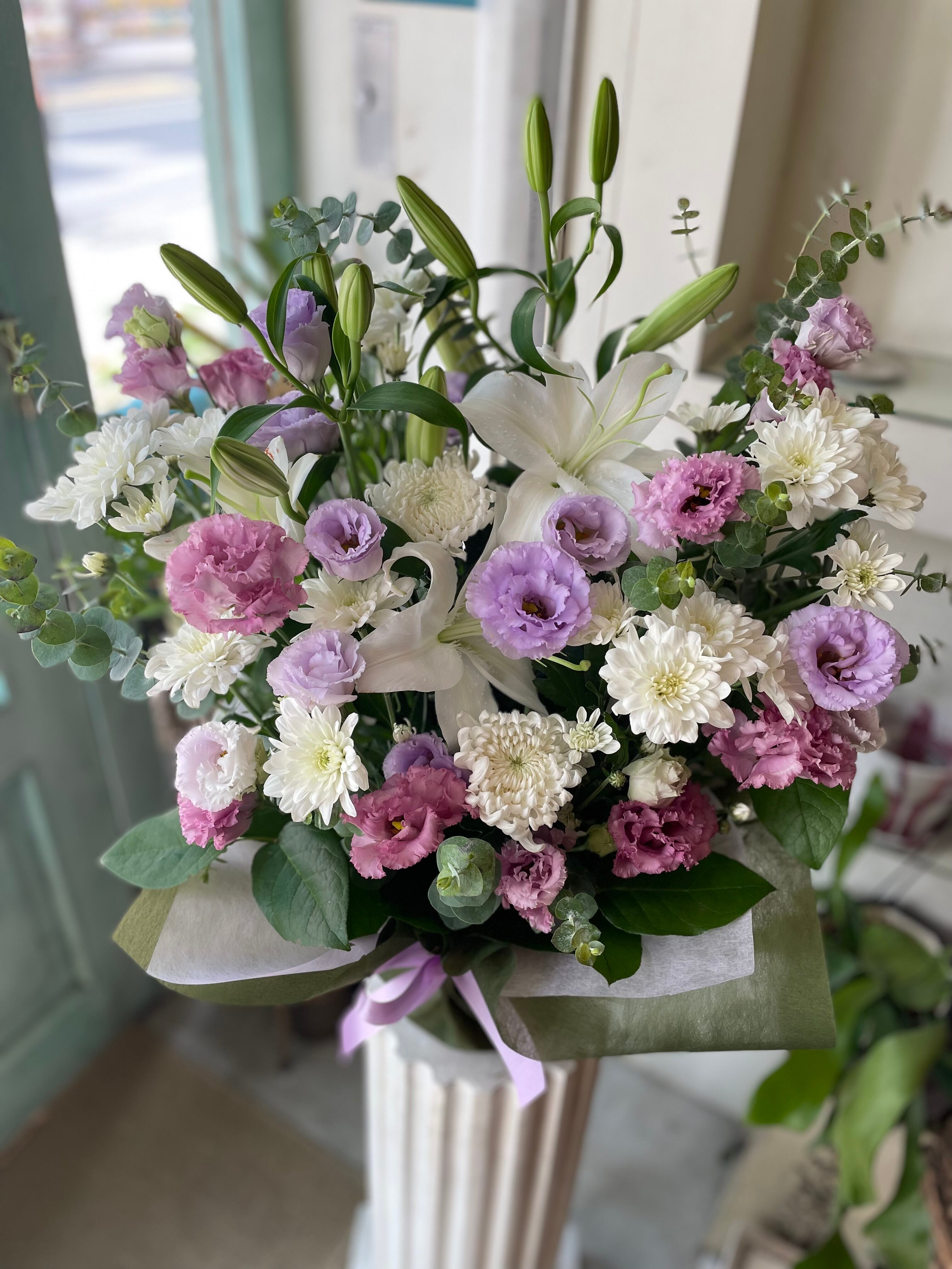 お悔やみギフト「Sympathy」は、心からの哀悼の意を表すための優美なアレンジメントです。白いユリをメインに、季節の花であるトルコキキョウやマムが華やかに彩り、淡いパープルピンクのアクセントが心に残る特別な一品となっています。