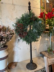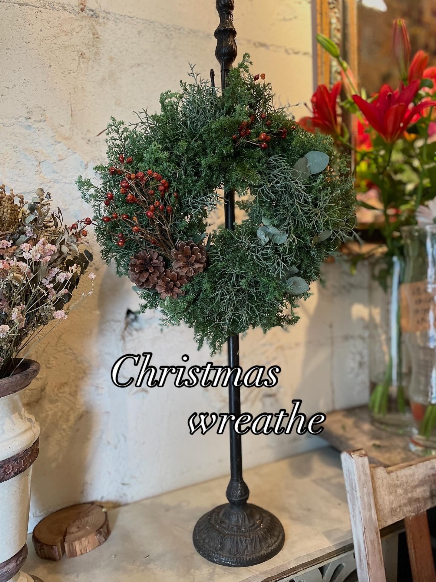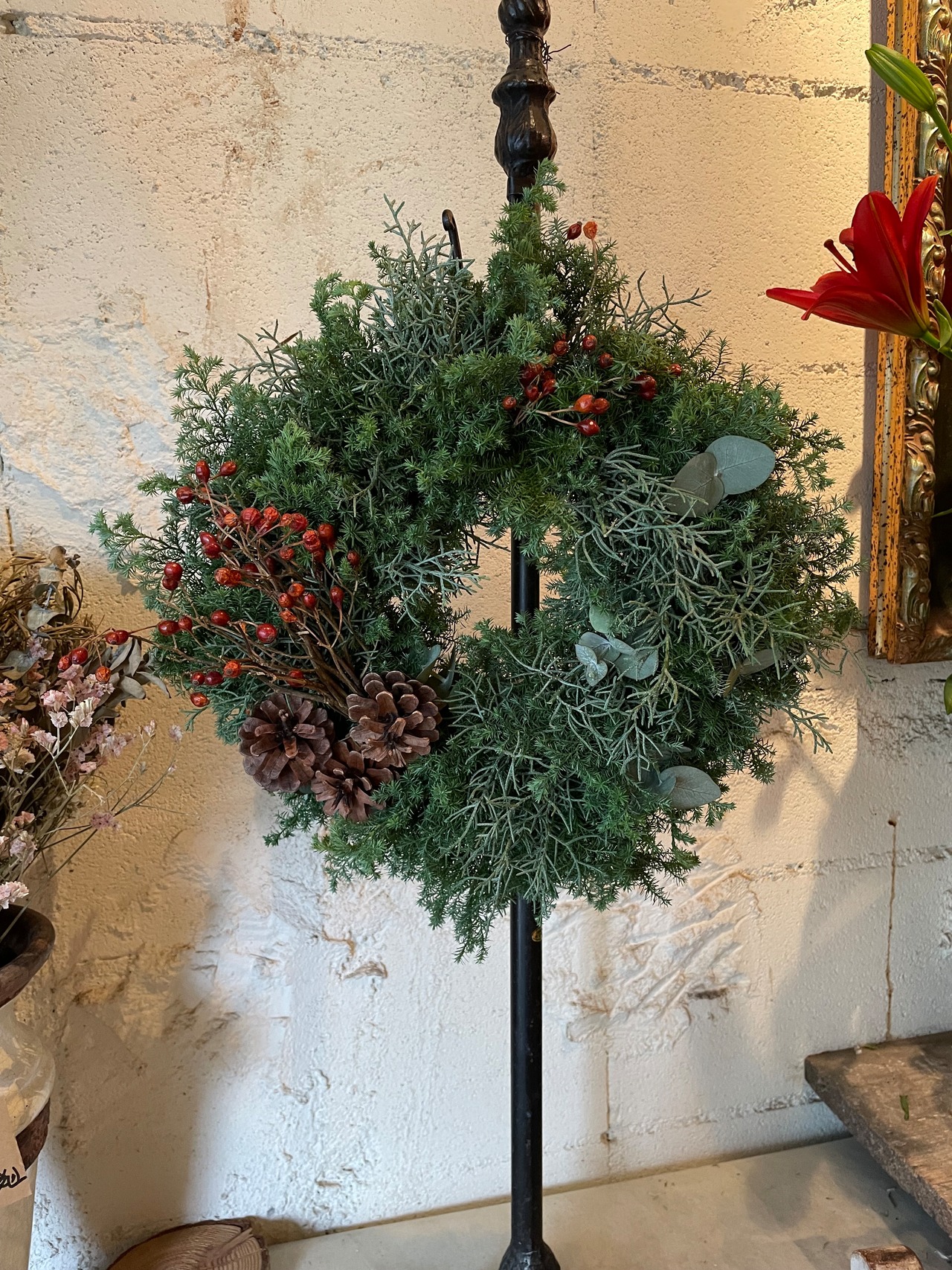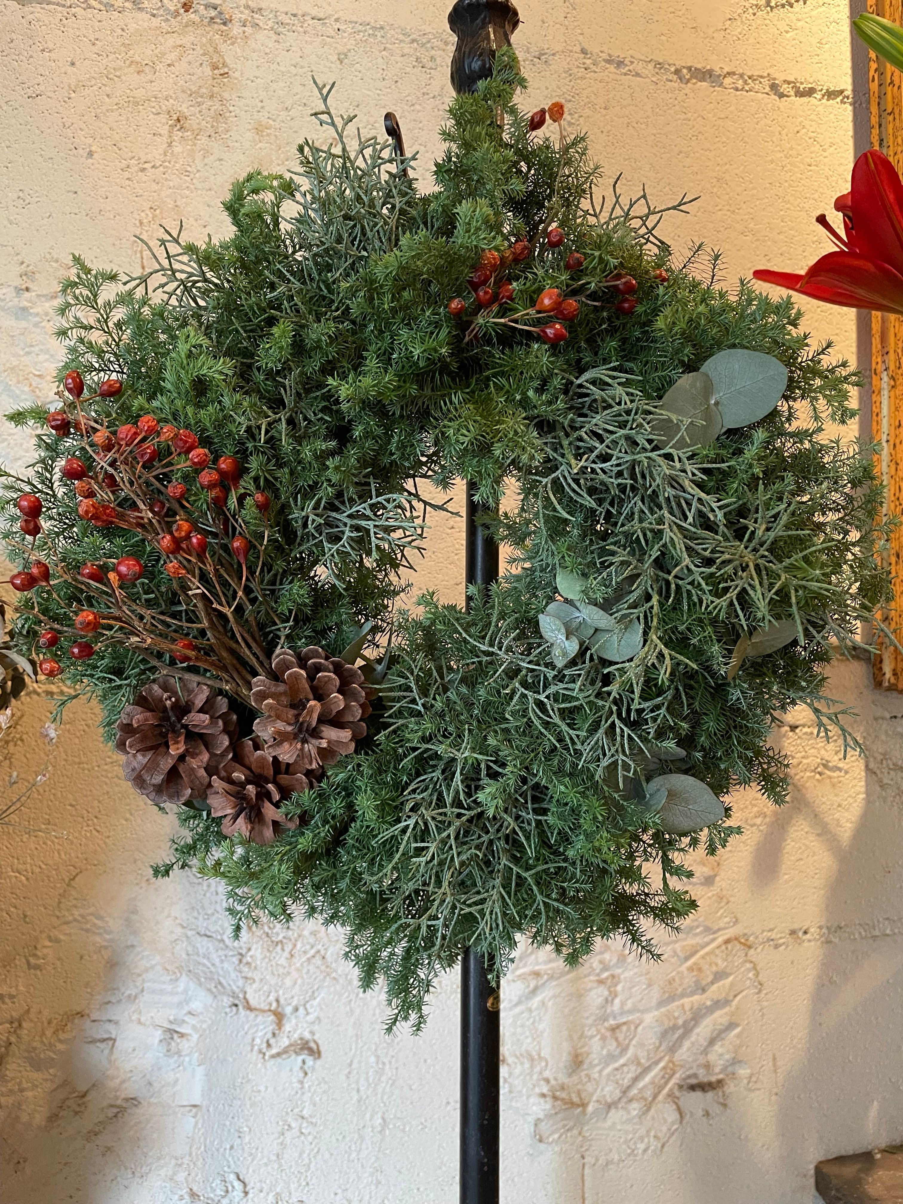 花材:ヒムロスギ、ブルーアイス、ユーカリ、バラの実、松ぼっくり