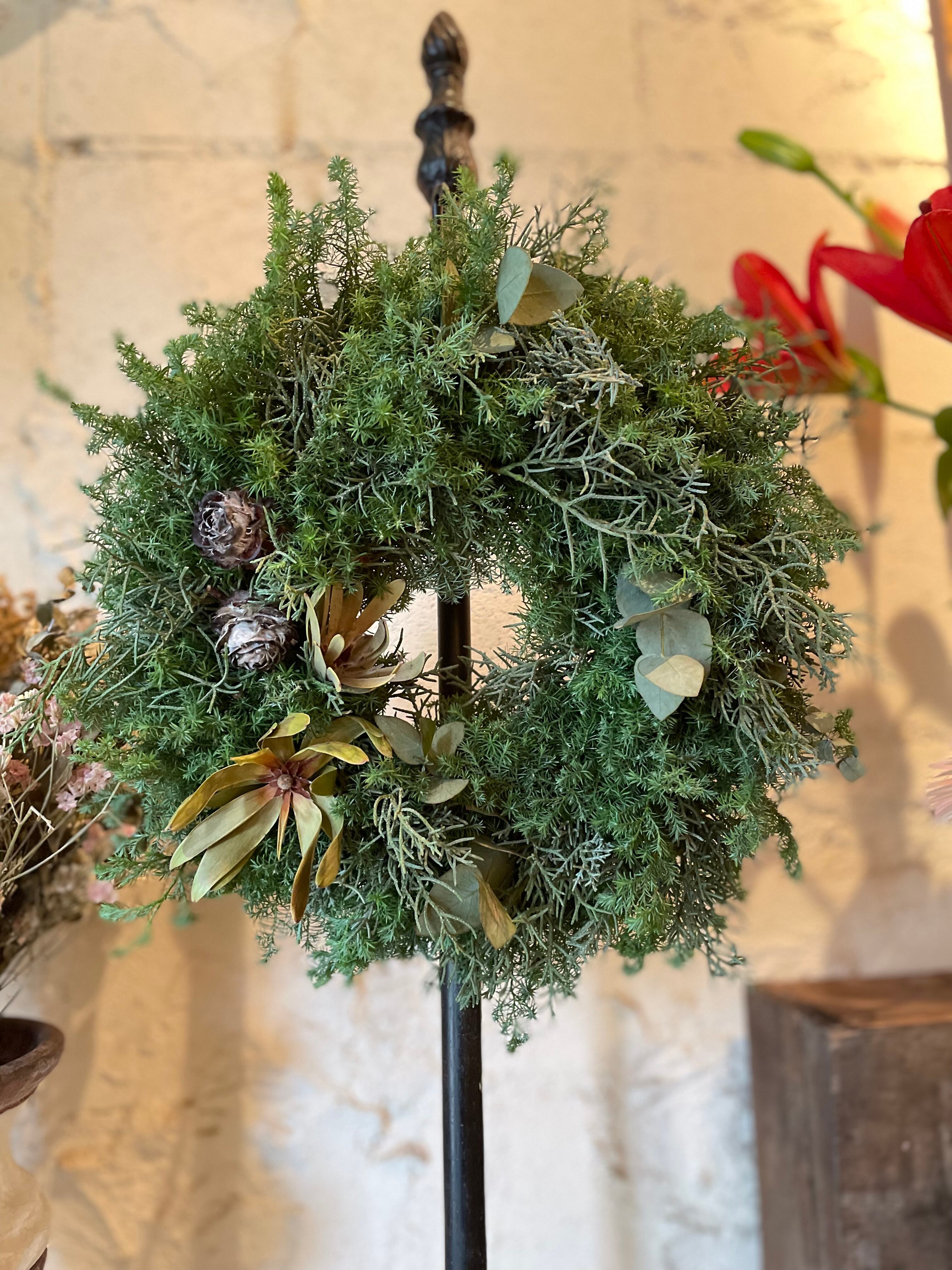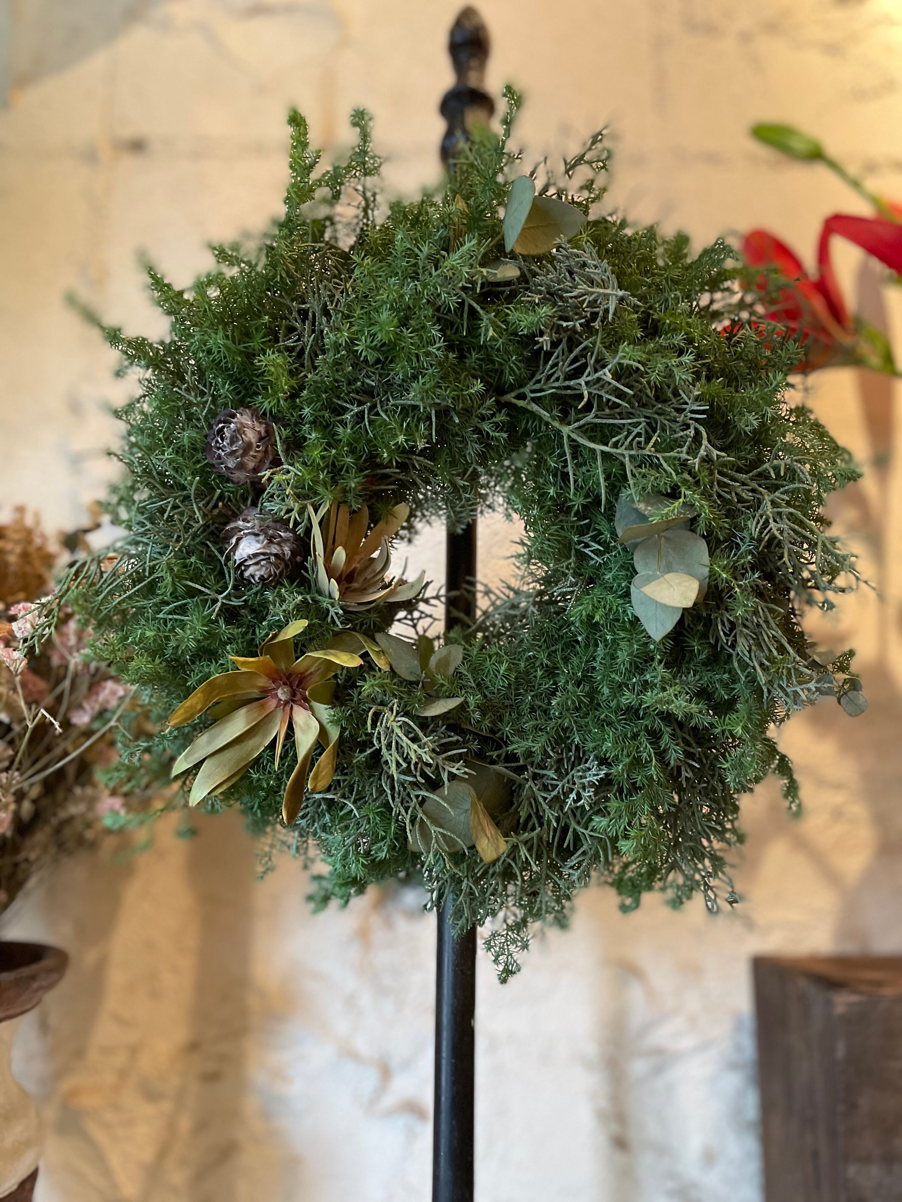 Xmasリース「森のGreen」は、ナチュラルなテイストが心地よいクリスマスリースです。ヒムロスギとブルーアイスを基盤として、ユーカリやリュウカデンドロをアクセントにあしらい、シンプルでありながらも森の豊かさを感じさせるデザインとなっています。このリースは、真のクリスマスの雰囲気を演出し、心を温める空間を作り出す理想的なアイテムです。