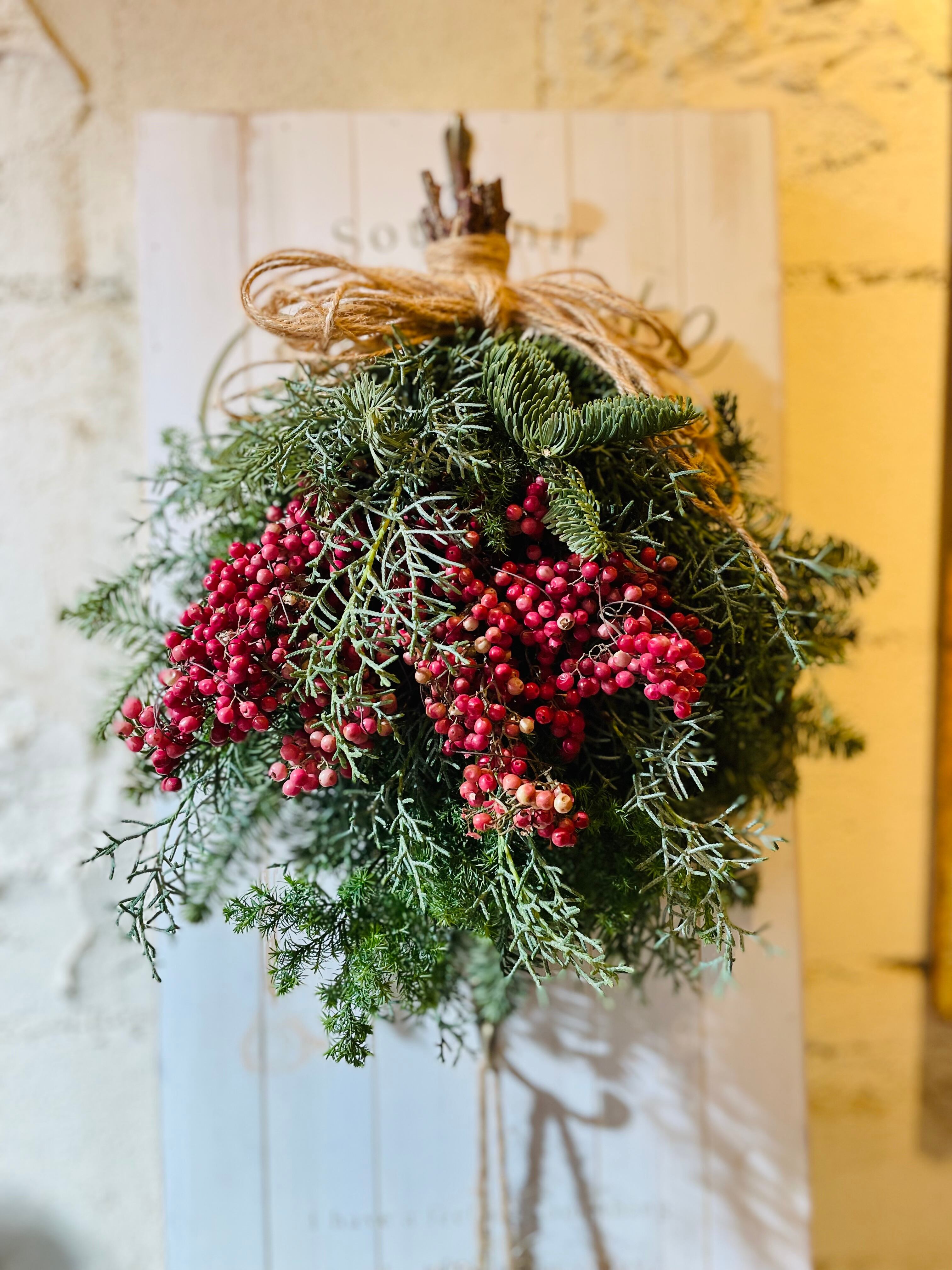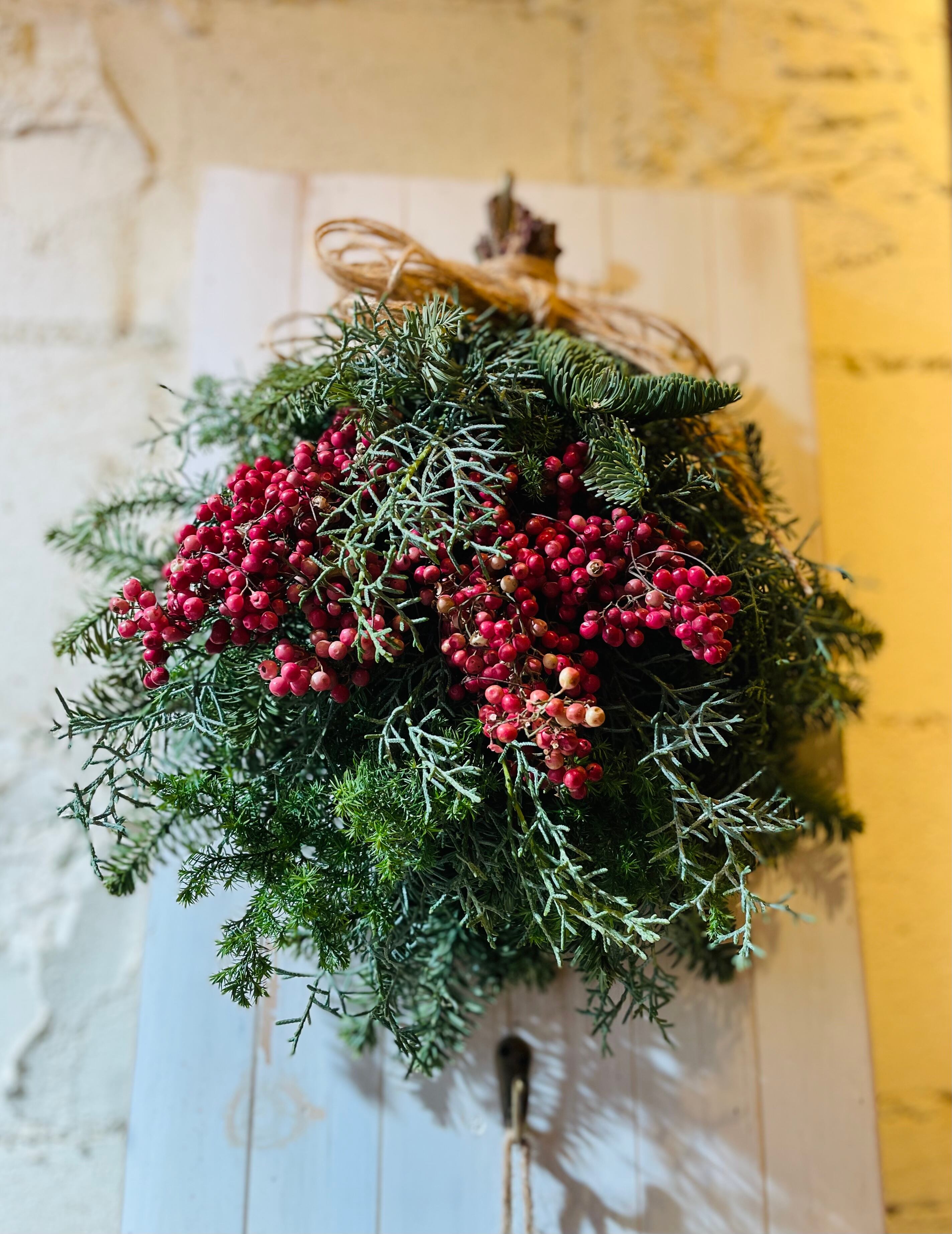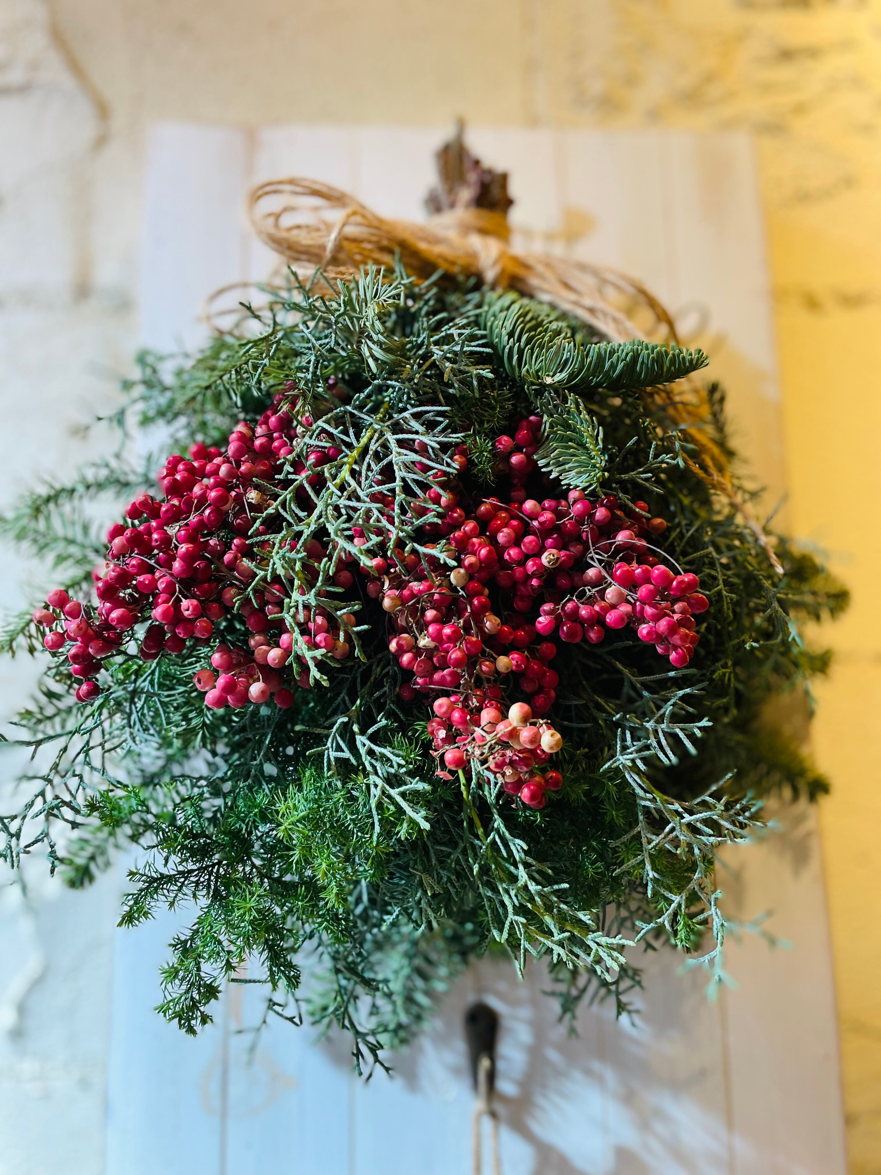 Xmasギフト「ペッパーベリーと香りの針葉樹」は、香り豊かな針葉樹と珍しいペッパーベリーを組み合わせたスワッグです。クリスマスの特別な時を彩るのにぴったりなアイテムで、どんなインテリアにもマッチする上品なデザインが特徴です。